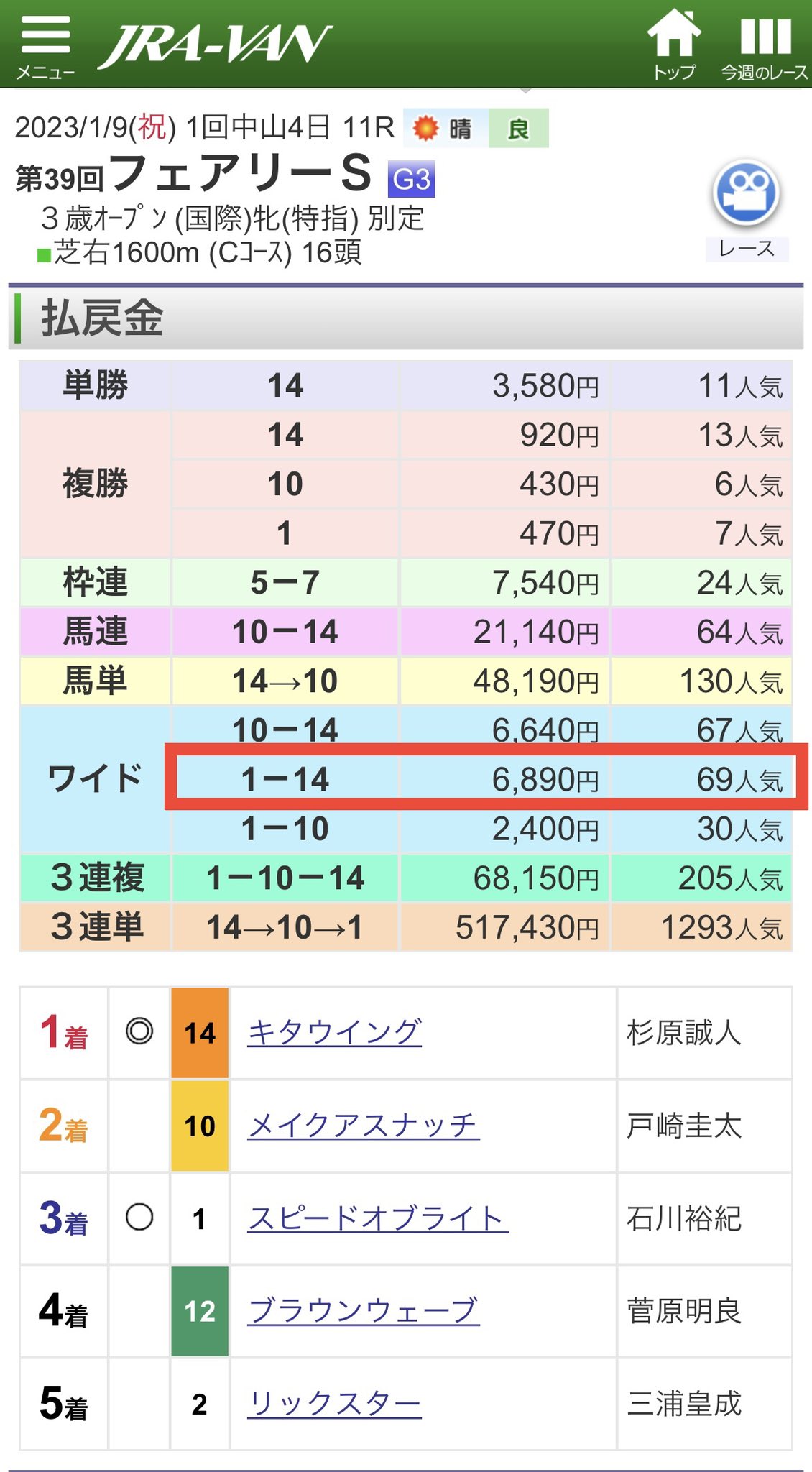 そして私は、キタウイングースピードオブライトの実績馬同士のワイド馬券1点勝負で、回収率6890%の大勝利。