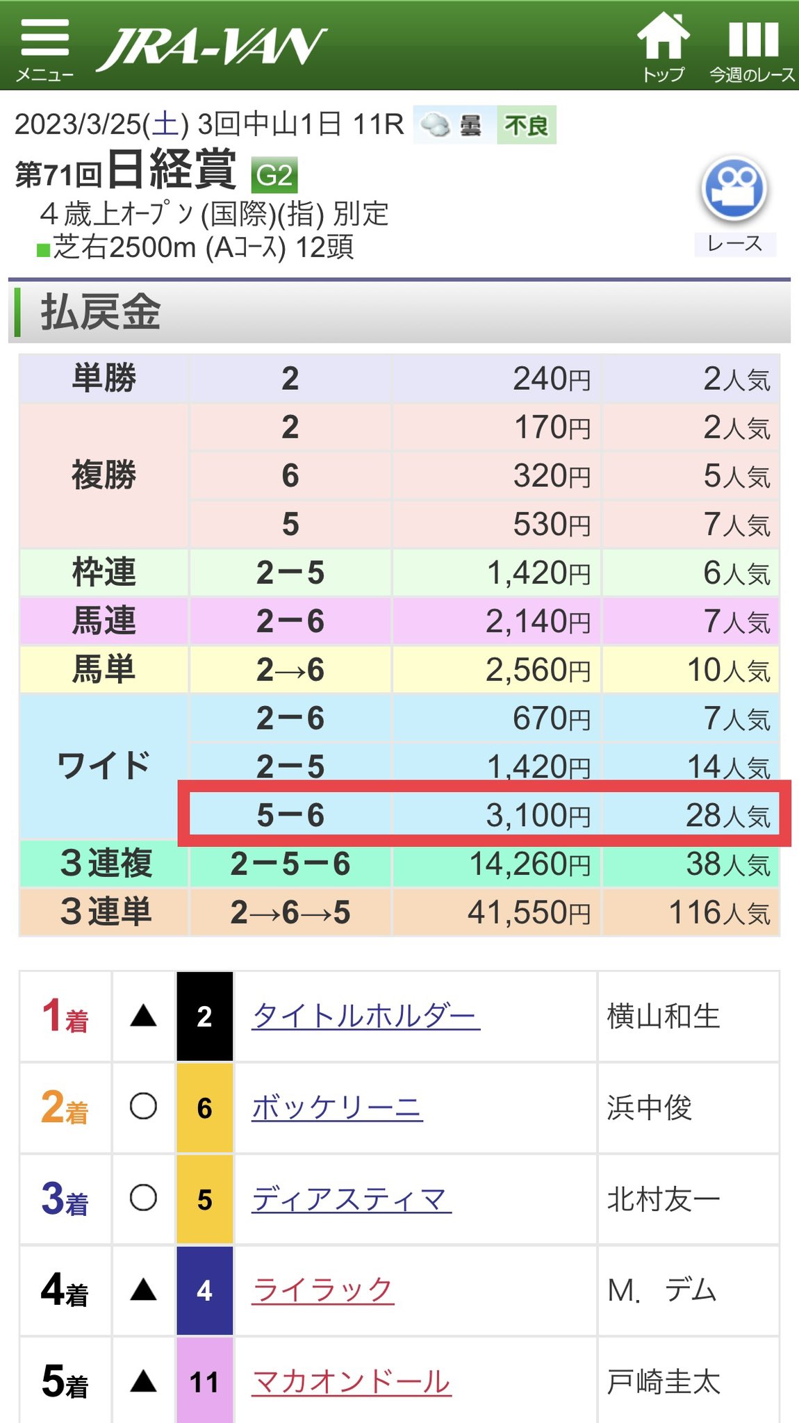 5番人気以内で収まって比較的獲りやすい割に、良い配当だと思うのですが、私は前述の通り、Win0。