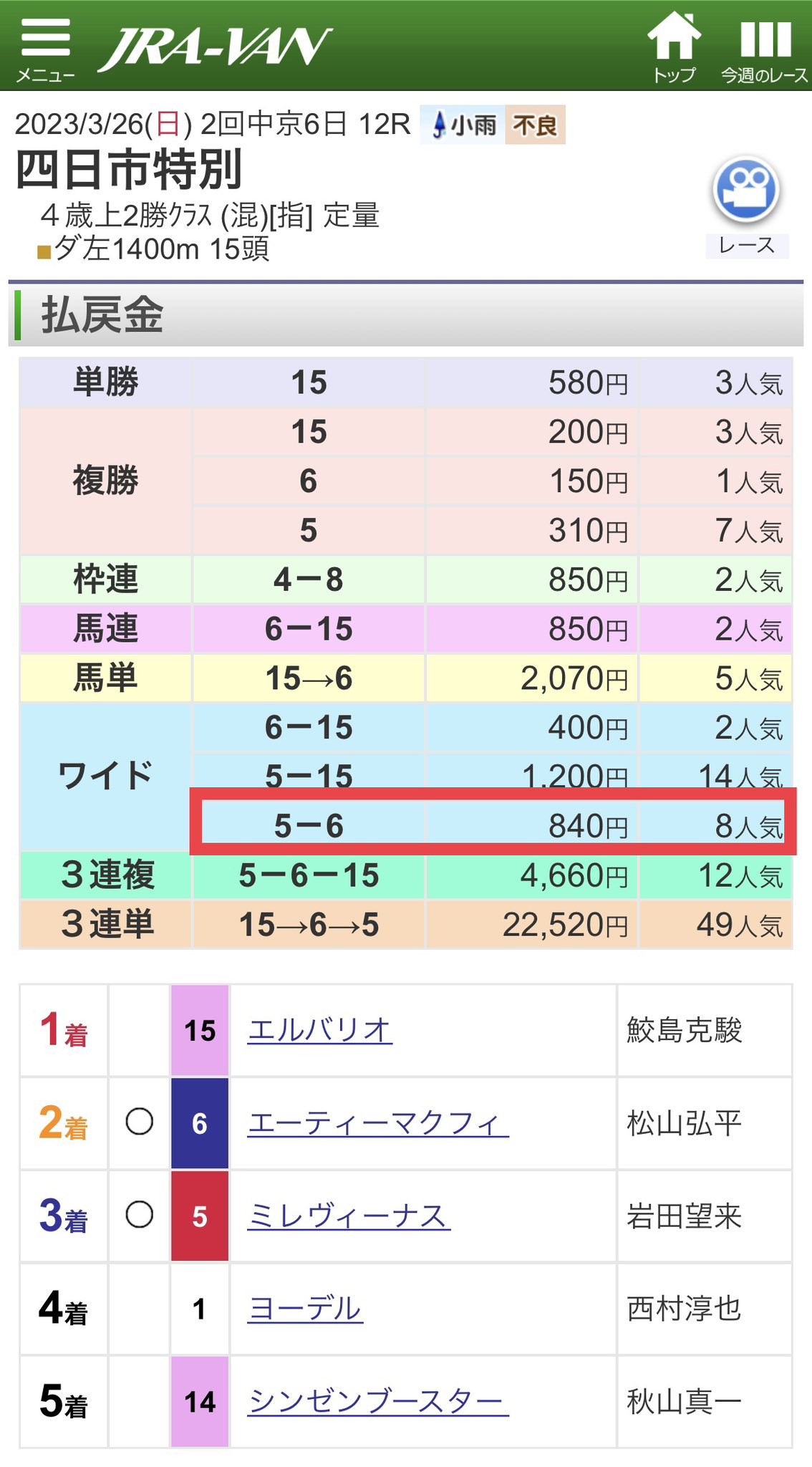 その馬たちを馬番の順に見ていくと、ヨリマルは勝った1勝クラスの競馬が不良馬場で初めて上がり最速の足を使ったように、馬場が向いた可能性が高いので評価を下げます。