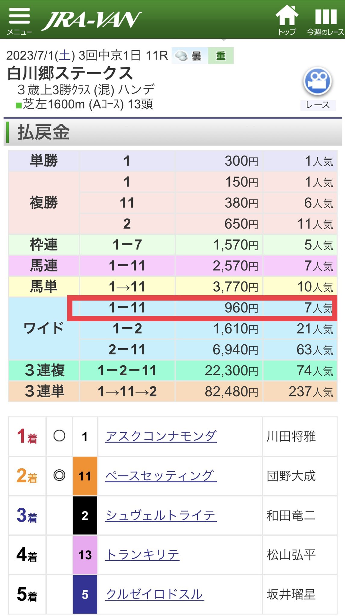 が仮に来ていたら、人気の和が23で1,000万近い配当になっていたのは間違い無し。