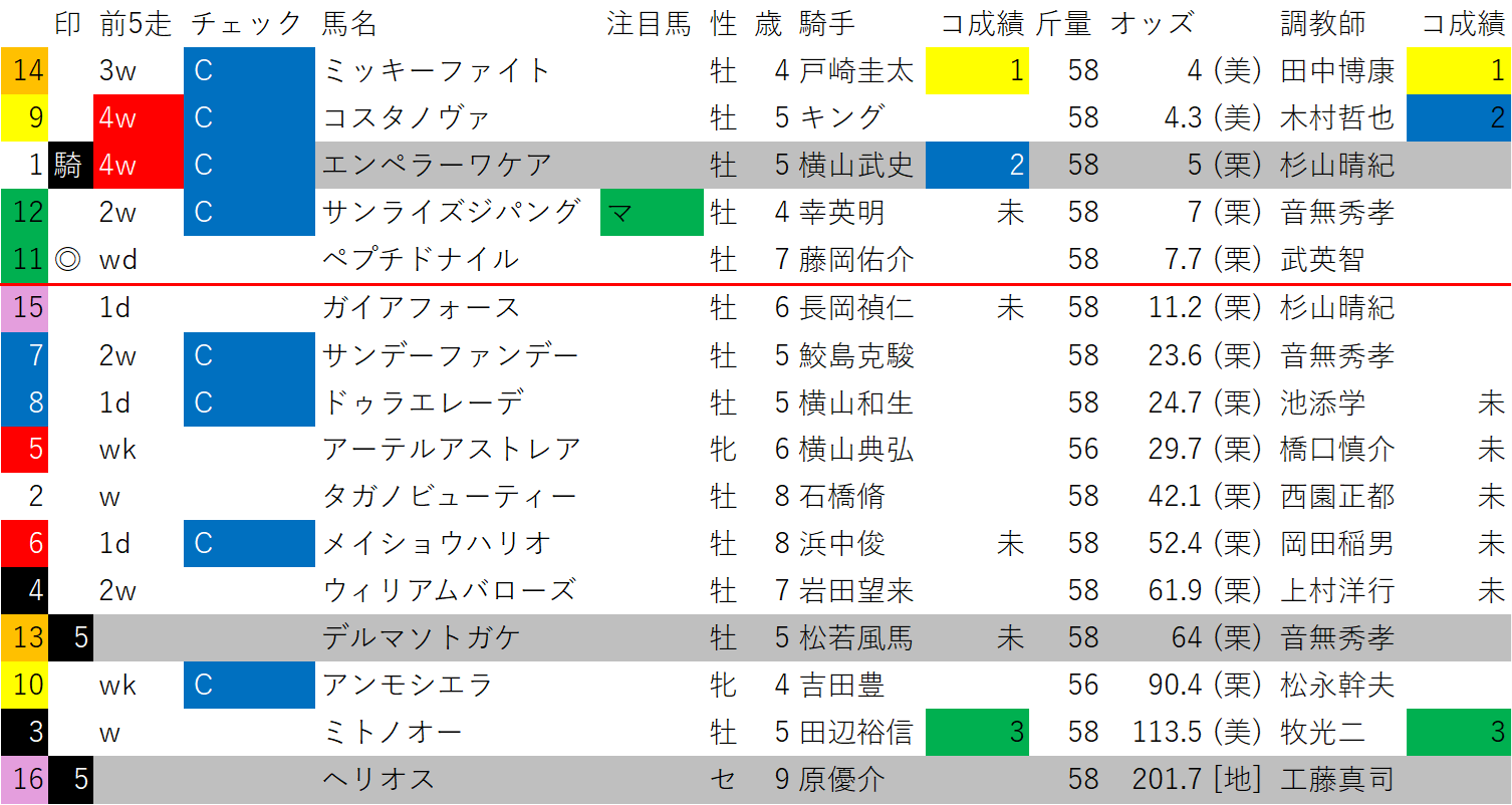 チェック馬、当コース別騎手成績3位、当コース別調教師成績1位のミッキークレストを推します。