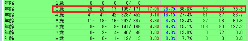見ておわかりのとおり、3歳馬はダントツの成績。