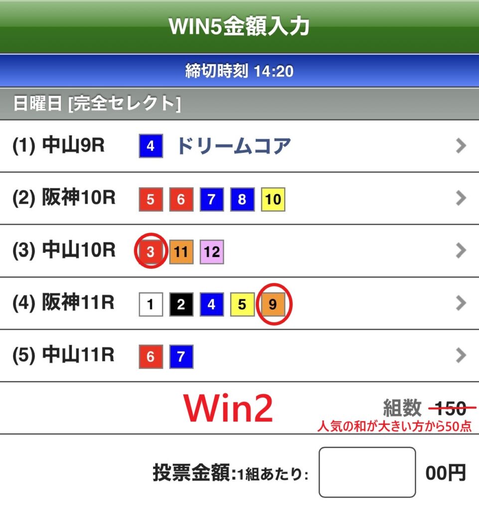 Win2堺ステークスはもともと荒れ想定でしたが、当日人気を見てWin4ポートアイランドステークスも荒れると見て、両レースを単勝5番人気から9番人気をゾーン買いしたので、もともとの予想で買うと、何と450点とありえない買い目に。