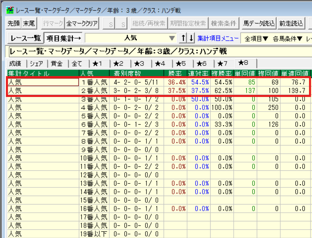 また、条件戦、オープンクラス如何を問わず、ハンデ戦は単勝5番人気から9番人気までの勝率は高くなりますので、覚えておいてください。
