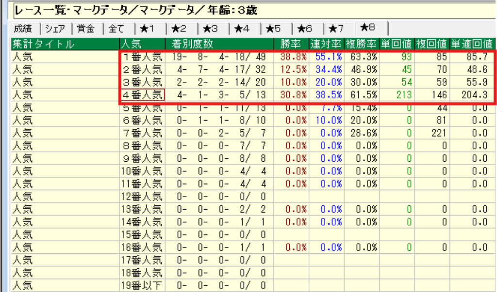 逆に言うとこのパターンで単勝4番人気までなら抑えないと行けない馬。