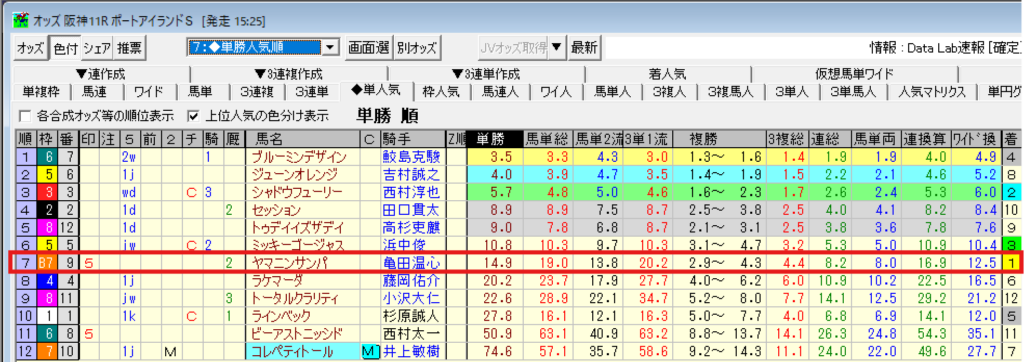 Win4 阪神11R ポートアイランドステークス 勝馬 7人気 ヤマニンサン