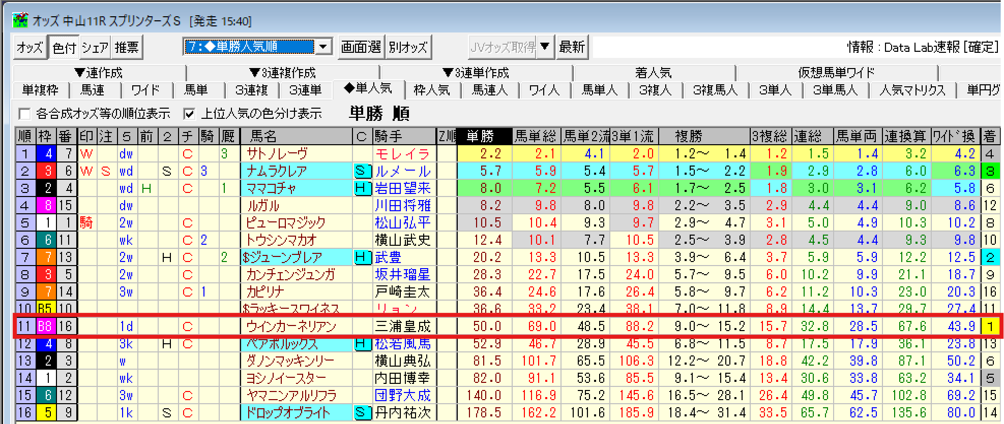 Win5 中山11R スプリンターズステークス 勝馬 11人気 ウィンカーネリアン