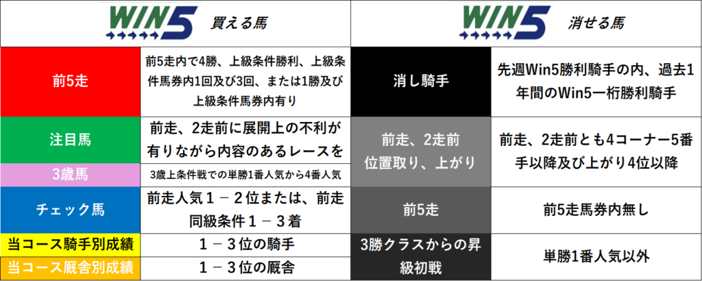 まずは、Win5の買える馬、消せる馬のデータの一覧をご紹介します。