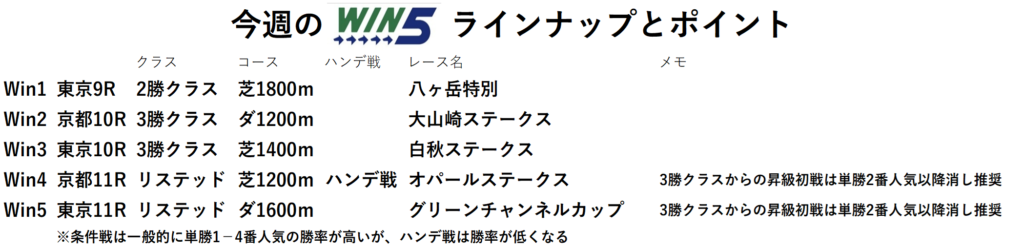 条件戦3レース、オープンクラス以上が2レースというのは、よくあるWin5の設定なので、出走馬を加味せず言うと、人気の和は標準の12から19あたりの決着を想定します。