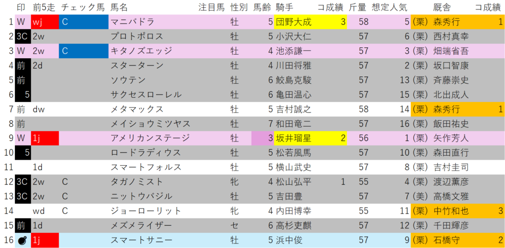 ここも唯一の3歳馬で、高勝率の前5走で上級条件馬券内1回の想定1番人気アメリカンステージを抑えます。