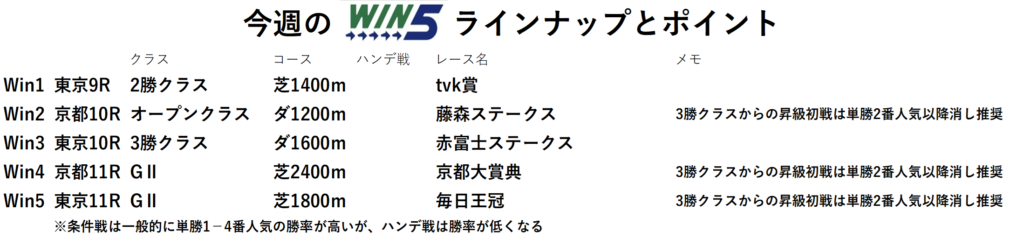 あと、気を付けて頂きたいのが、Win2藤森ステークス、Win4京都大賞典、Win5毎日王冠ともオープンクラス以上で、