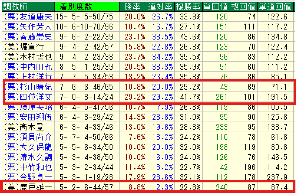 鹿戸雄一厩舎が今回勝って5勝なので、実際は杉山晴紀、四位洋文厩舎のみ。
