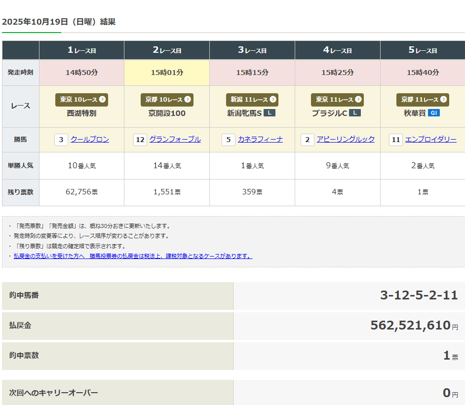 10番人気ー14番人気ー1番人気ー9番人気ー2番人気で人気の和が36、的中票数が1票、配当が562,521,610円。