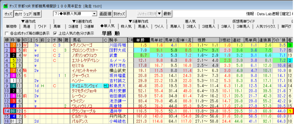 Win2 京都10R 京都競馬場開設100周年記念 勝馬 14人気 グランフォーブル
