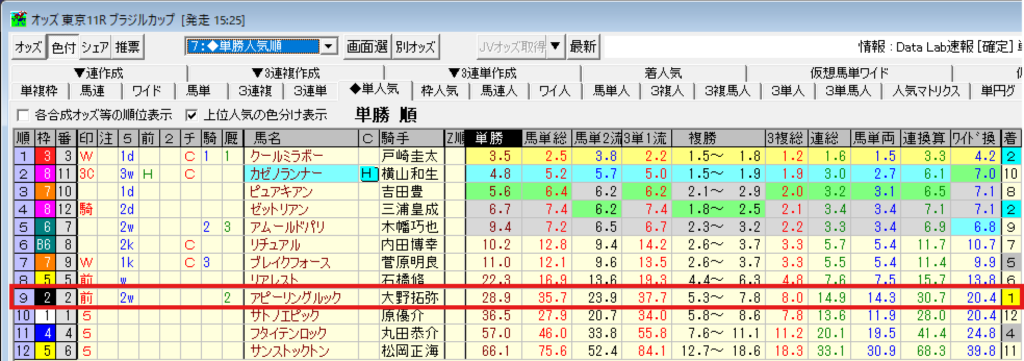 Win4 東京11R ブラジルカップ 勝馬 9人気 アピーリングルック