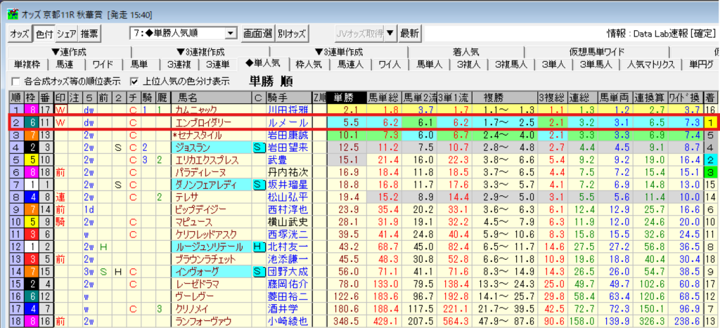 「データから見た推奨馬」には、カムニャックと、エンブロイダリーをセレクトし、当日人気も確認してそのまま購入。