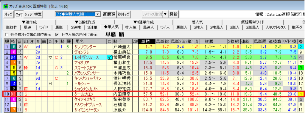 Win1 東京10R 西湖特別 勝馬 10人気 クールブロン