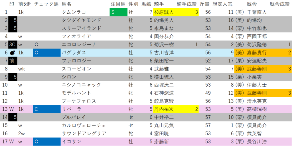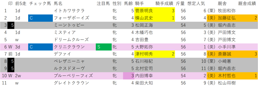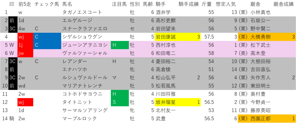 コース傾向からは単勝1番人気はセレクトしたいですし、唯一の条件戦なので、ここは堅め決着を望みたいので、Aゾーンで2頭セレクトします。