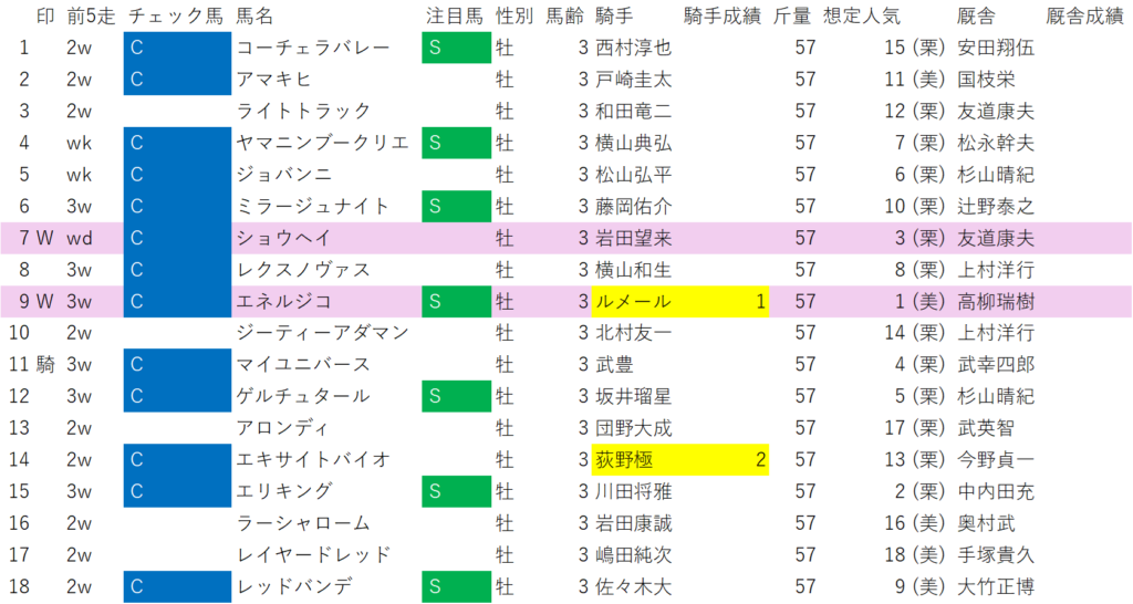 ショウヘイは、勝ち味に遅い嫌いはありますが、ダービー3着、神戸新聞杯2着と手堅く、他の有力馬と比べ前目につけられる優位性を買いたい。