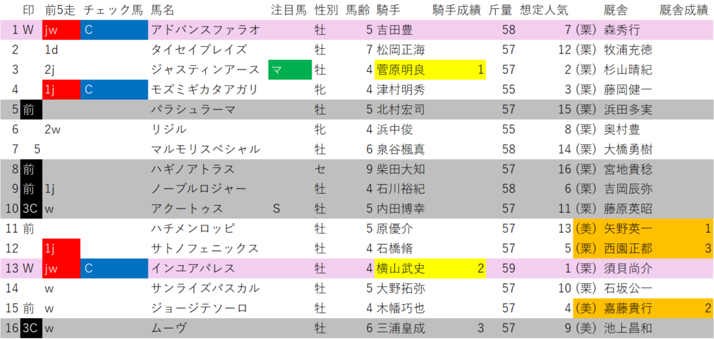 想定1番人気のインユアパレスと、想定7番人気のアドバンスファラオをセレクトします。
