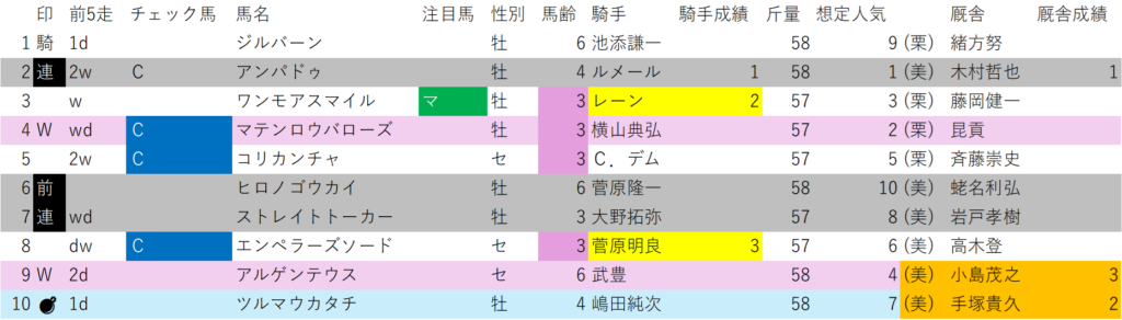 想定2番人気のマテンロウバローズと、想定4番人気のアルゲンテウスをセレクト。