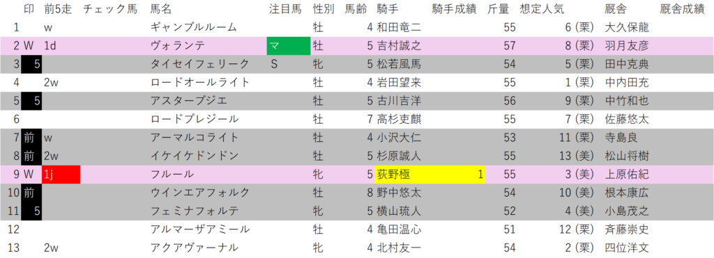 正直、あまり自信はありませんが、想定3番人気のフルールと、想定8番人気のヴォランテをセレクトします。