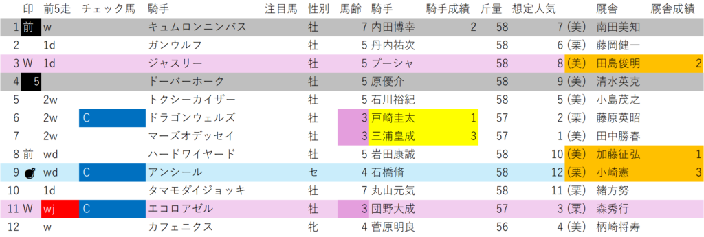 データ母数が僅少で、荻野極騎手以外は勝利無しで、2位以下の騎手は出走表に反映させません。