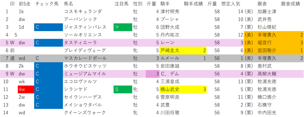 これから買える馬データ、消せる馬データを網羅した出走表をご覧いただきますが、出走表を簡単にご説明いたします。