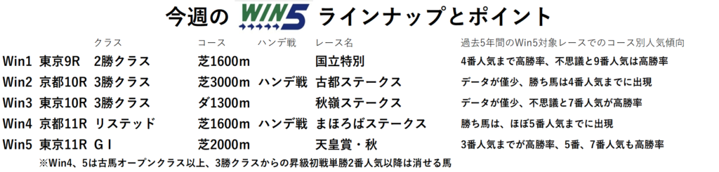 また、Win4まほろばステークス、Win5天皇賞・秋が古馬のオープンクラス。