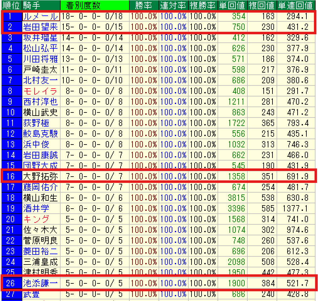 こちらは過去1年間のWin5騎手リーディングで赤で囲んでいるのは前回勝利騎手。