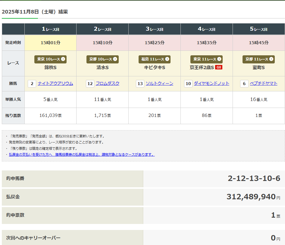 5番人気ー11番人気ー1番人気ー1番人気ー16番人気で人気の和が34、的中票数が1票、配当が31,312,489,940円。