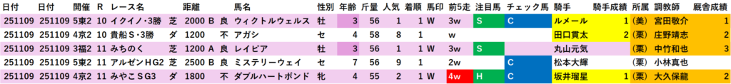 前回(2025年11月9日)のWin5を買える馬データ、消せる馬データで簡単に振り返ります。
