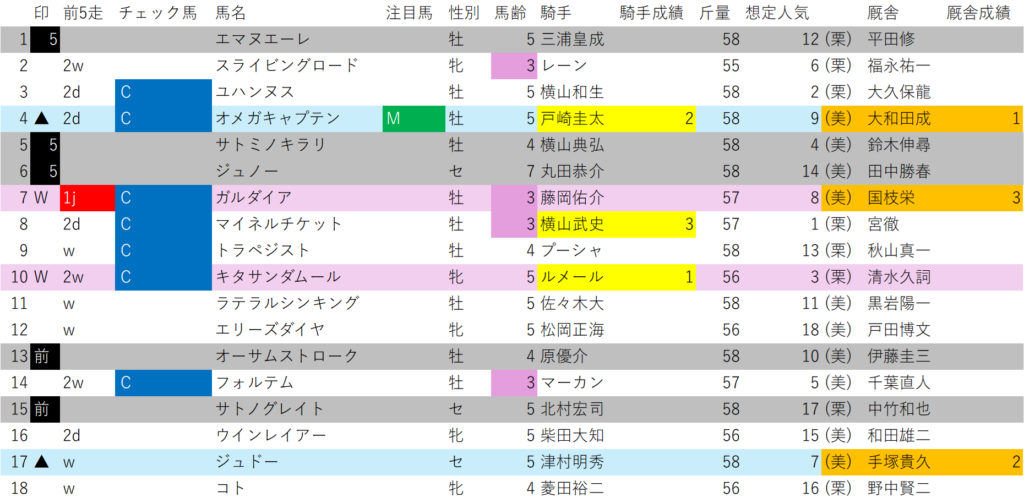 想定7番人気のジュドー、想定8番人気のガルダイア、想定9番人気のオメガキャプテンまでを候補とします。