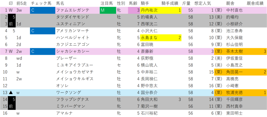 想定1番人気のファムエレガンテと、想定6番人気のシャカシャカシーを指名します。