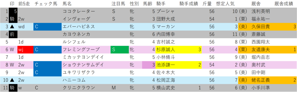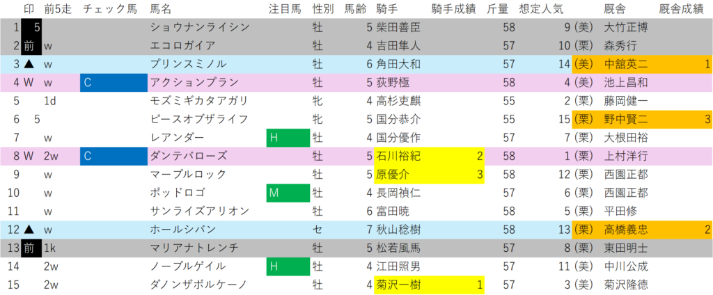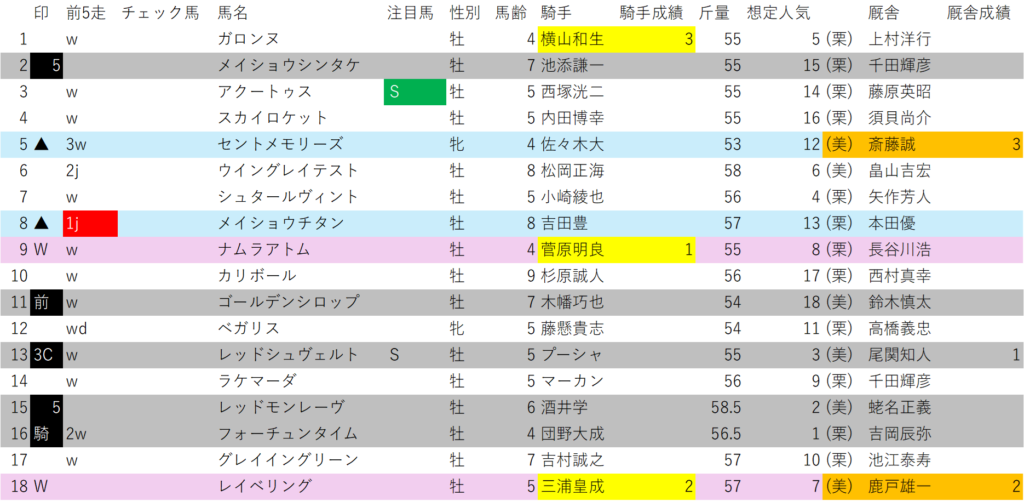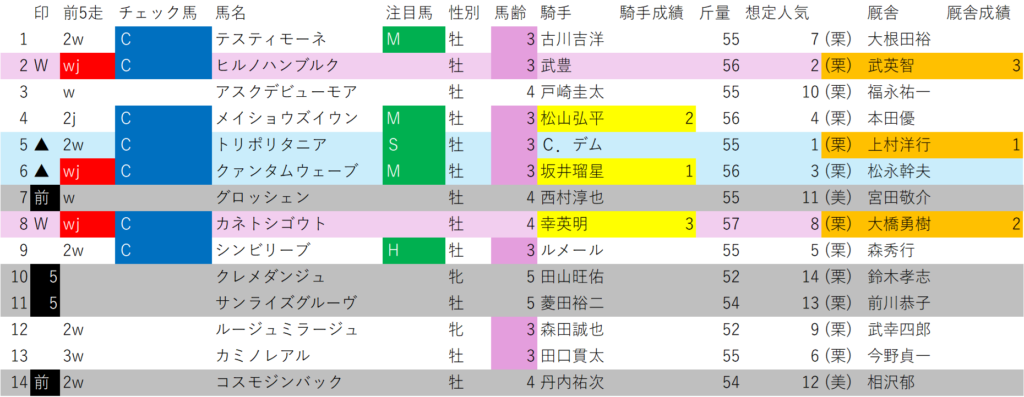 更にリステッドのハンデ戦、もうこれだけ聞いても、このレースかなりヤバい気がするのですが、それに加えチェック馬(前走単勝1番から2番人気、または前走同級馬券内)が不在の混戦のレース。