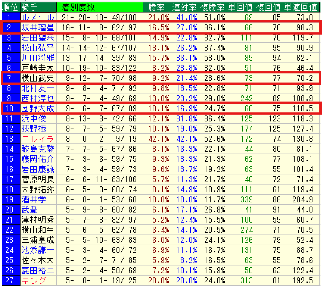 | (栗)池添学 | 3- 2- 0- 6/11 | 27.3% |