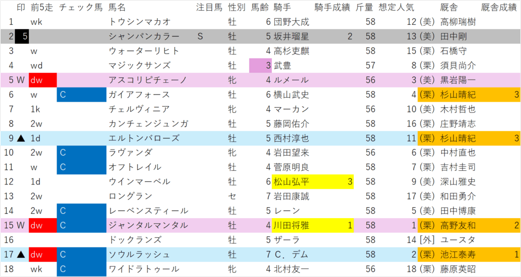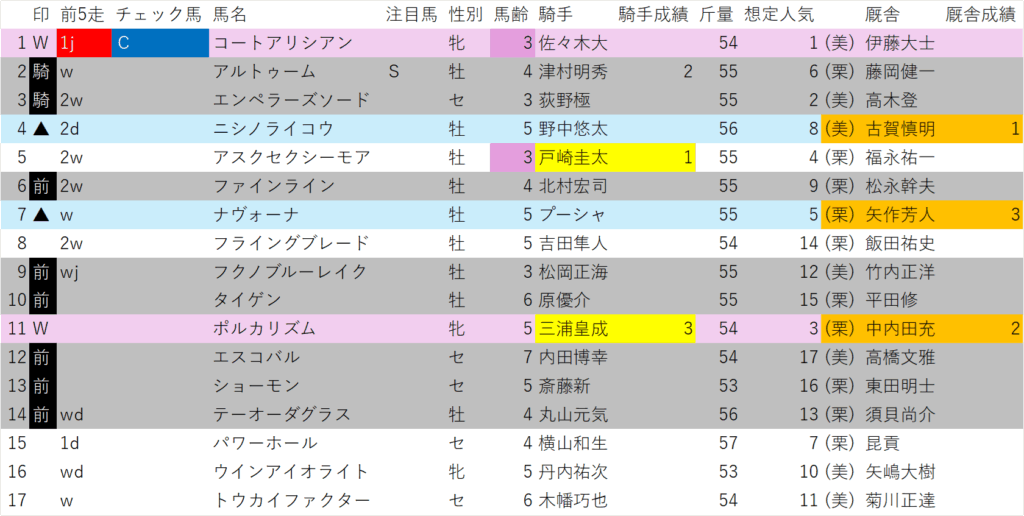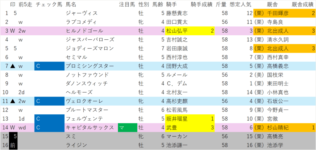 出走表をご覧になられておわかりの通り、かなり消せる馬が多いレースで買える馬から素直に買っていきたい。