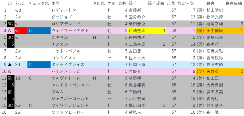 だが、当コース厩舎別成績で圧倒的な勝率を誇る田中博康厩舎の想定1番人気のウェイワードアクトは外せない。