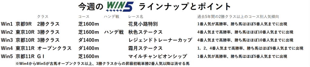 - Win5 京都芝1600m 単勝1番人気が高勝率、勝ち馬はほぼ5番人気までに出現。