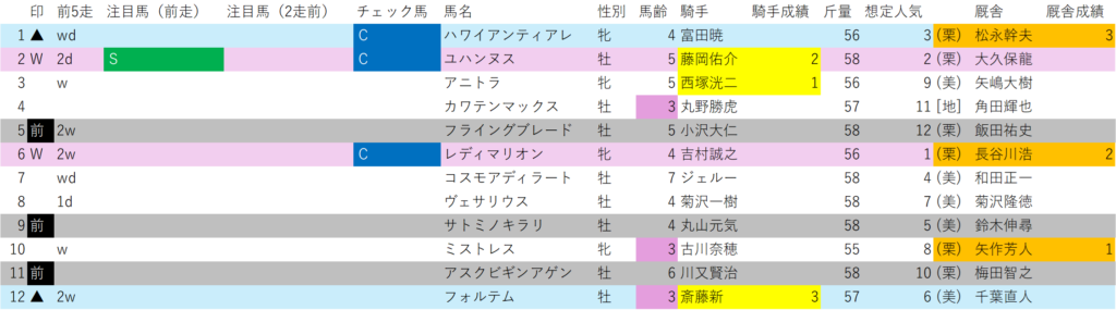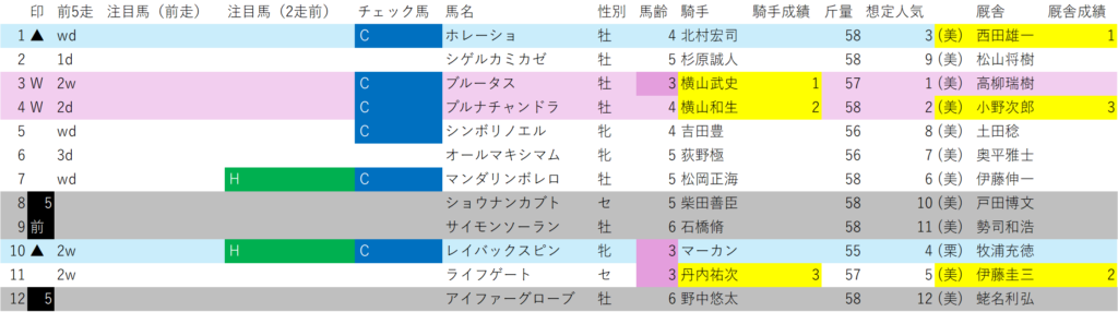 上位3厩舎とも勝ち鞍無しで、出走表には反映させません。