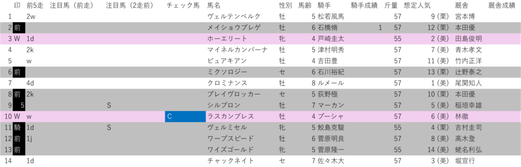 本来の買える馬だけで勝負であれば、この1頭だけなのですが、年末まで1レース2頭縛りプレイですので、同じ4歳馬の③ホーエリートをセレクトさせてください。