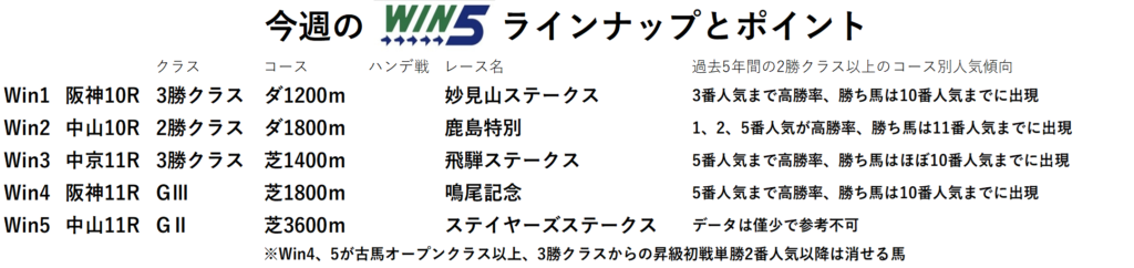 • Win5 中山芝3600m データは僅少で参考にならず。