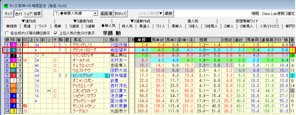 Win4 阪神11R 鳴尾記念 勝馬 2人気 デビットバローズ
