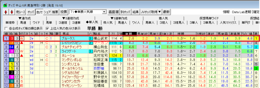 Win2 中山10R 鹿島特別 勝馬 1人気 ブルータス
