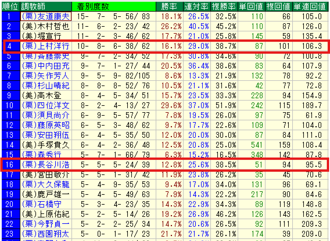 上位厩舎では、上村洋行厩舎が勝利で、長谷川浩大厩舎が勝利しランクイン。