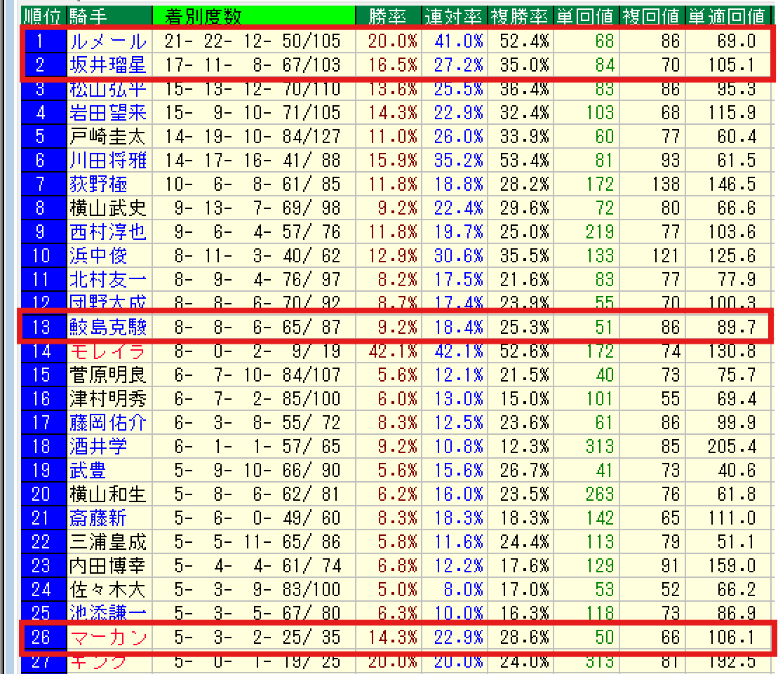 横山武史、戸崎圭太騎手がかなりの高勝率で、当然要警戒です。