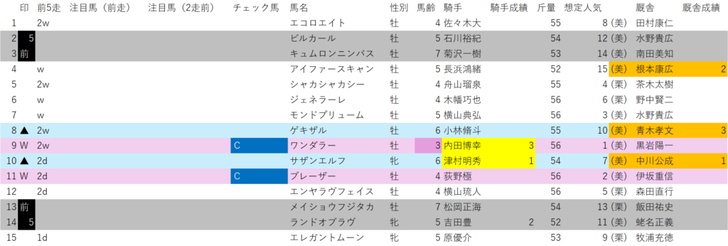 サザンエルフは、当コース騎手別成績1位の津村明秀騎手と当コース厩舎別成績1位の中川公成厩舎との組み合わせ。