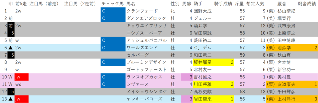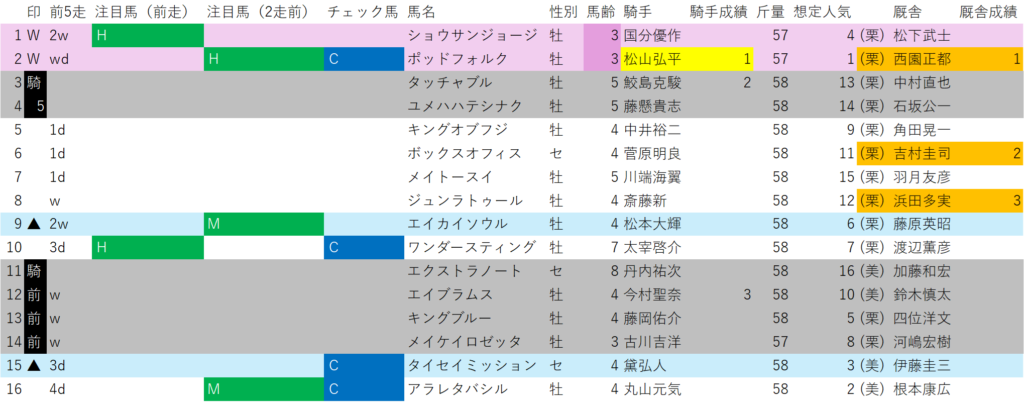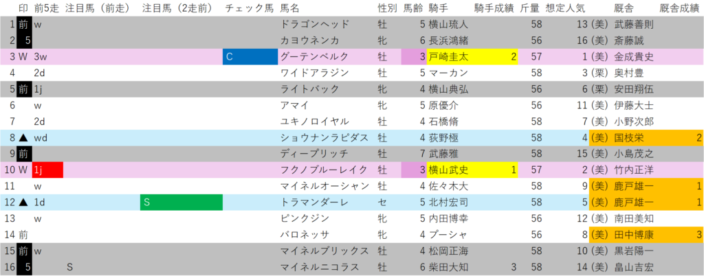 この馬も4戦で1勝クラスを卒業し、重賞挑戦のユニコーンステークスは凡走でしたが、今回が長期休養明けで、新馬戦も勝つような仕上がりの早い馬で、出来次第でチャンス有り。