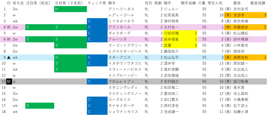初の重賞挑戦となり、3勝クラスからの昇級初戦の単勝2番人気以降は消せる馬としており、現在想定1番人気ながら、Wに指名するのはリスクがありますので、ここは印を▲まで。