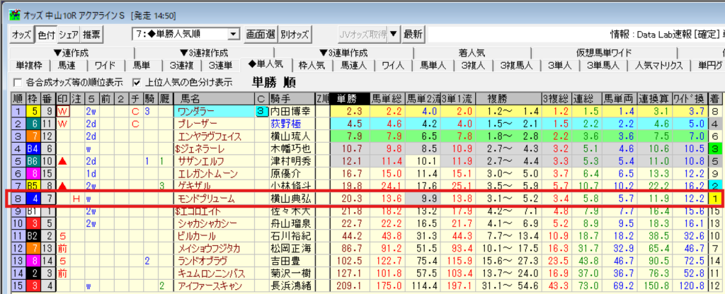 Win1 中山10R アクアラインテークス 勝馬 8人気 モンドプリューム